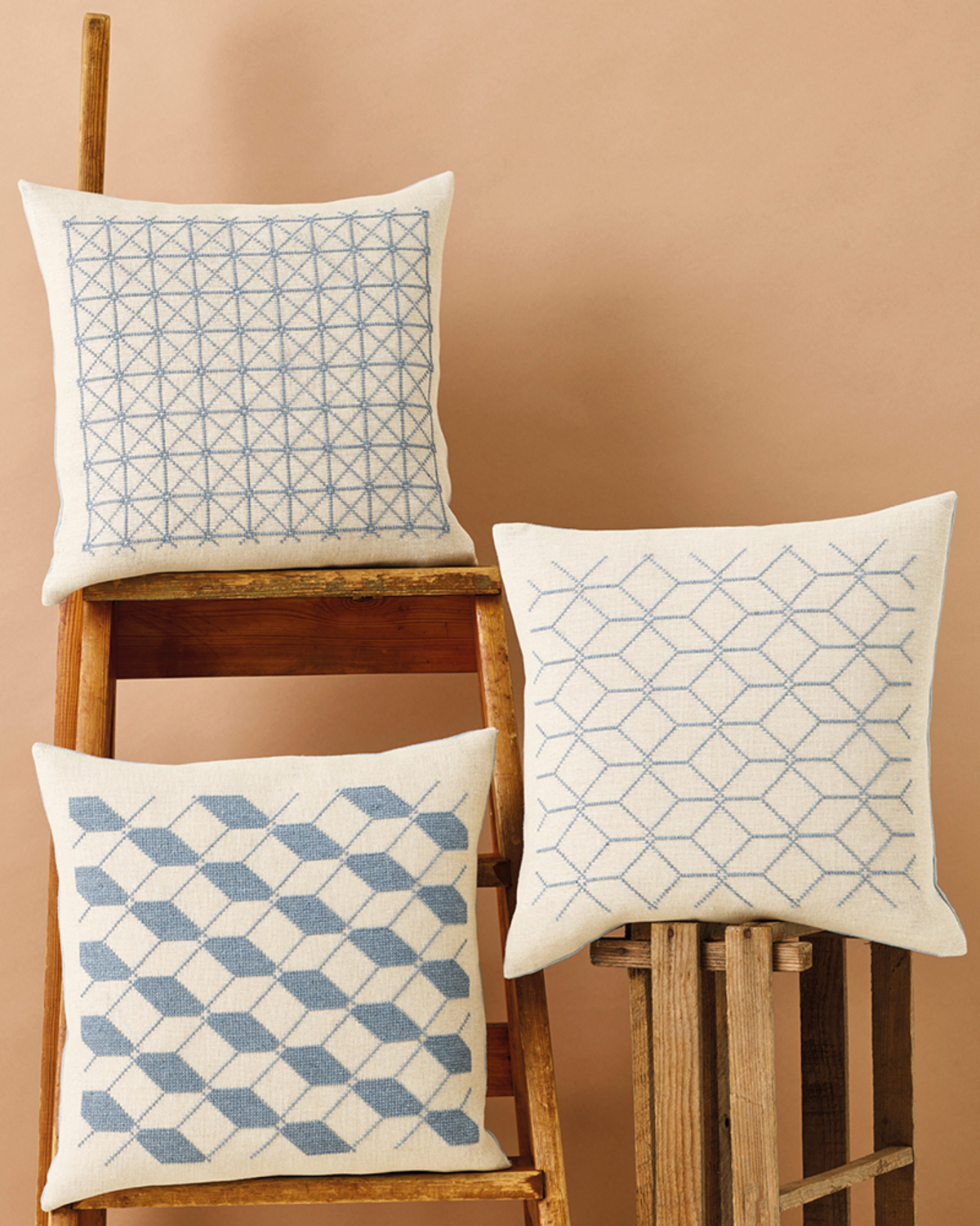 Bring skandinavisk stil ind i din bolig med dette smukke 3-i-1 pude – broderikit fra Permin. Kittet indeholder materialer og mønstre til en af de 3 viste  pudebetræk. Så du skal selv vælge hvilket motiv du har lyst til at brodere. Hvert pudevår har sit eget geometriske design i klassiske blå nuancer. De enkle linjer og grafiske former giver et moderne og stilrent udtryk, som passer perfekt i både stue og soveværelse.