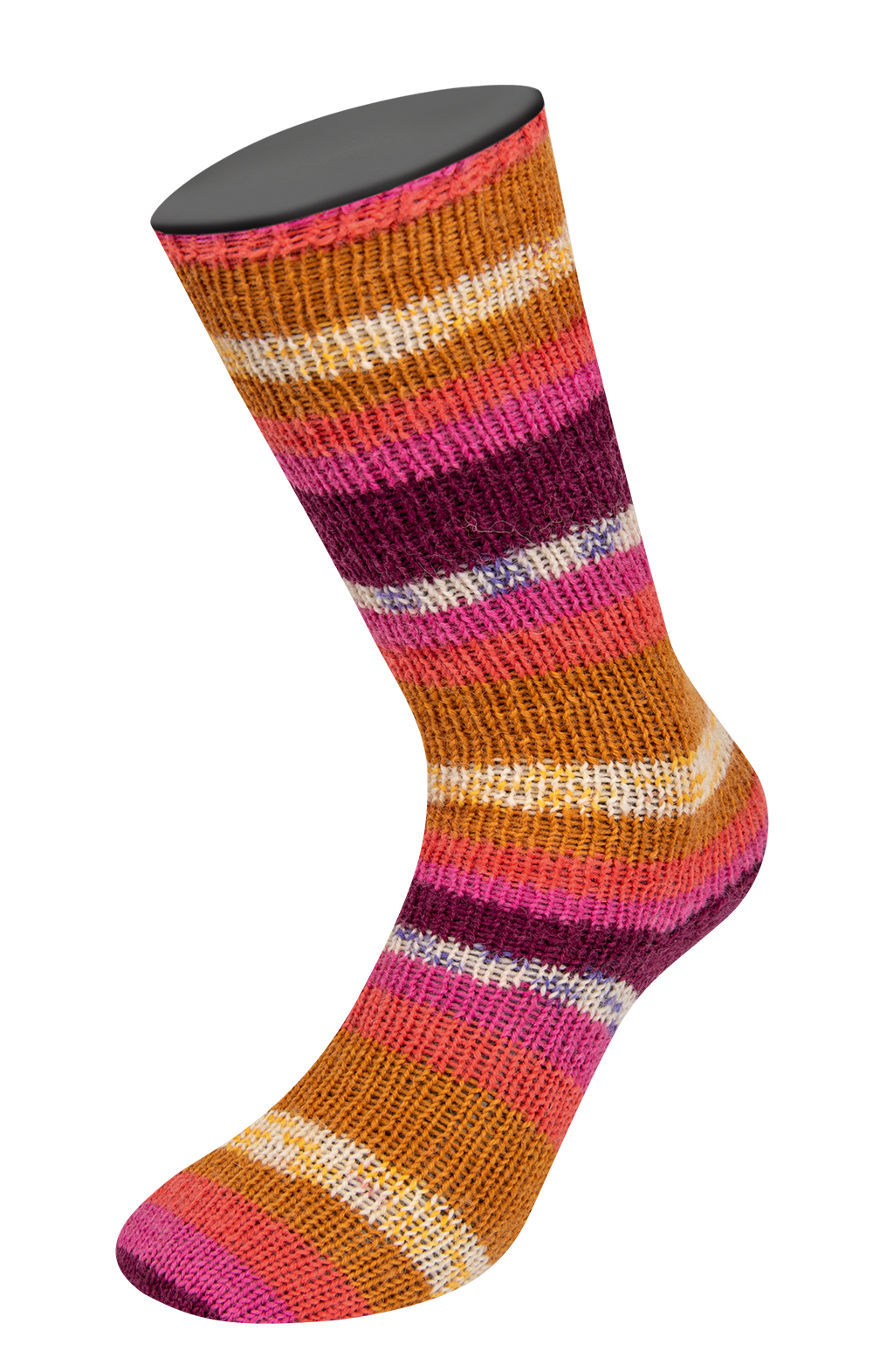 Med Aktion Strømpegarn farve 3012 fra Lana Grossa kan du strikke de fineste og meget dejlige varme strømper. Designet er flerfarvet og selvmønstrende, så du skal bare strikke løs og nyde farvespillet.