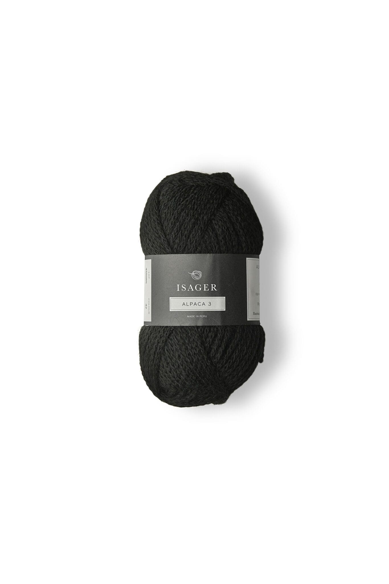 Alpaca 3 farve 30 Sort fra Isager Garn er et ”tubespundet” garn, der indeholder 50% uld og 50% Alpaca. Kvaliteten er den samme som Alpaca 2. Alpaca 3 farve 30 Sort kendetegnes ved at være blødt og meget luftigt på grund af spindingen. Denne spinding gør også gerne meget behagelig at strikke med, da garnet på ingen måde har løse tråder eller skiller ad. Hvis garnet strikkes alene er det skønt i en sweater, der f.eks. ikke bliver tung, selvom garnet er tykt. Garnet fungerer bedst, hvis det strikkes på tykke pinde. Alpaca 3 strikkes på pind 5 til faste kanter, men er ellers bedst på pind 6 eller 7.