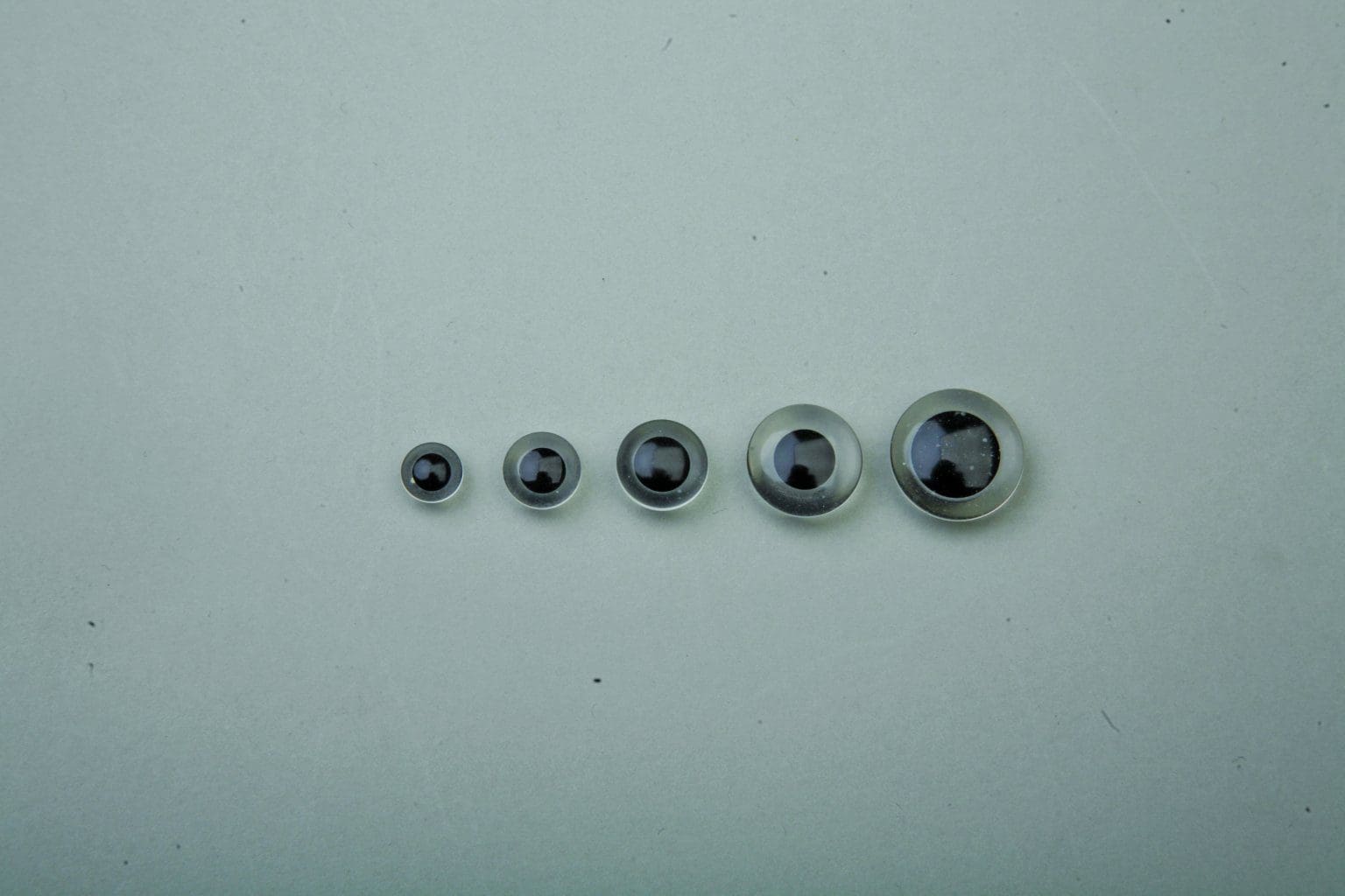 Bamseøje klar 8 mm til påsyning. Bag på bamseøjet er der et lille hul, som bruges til at sy øjet forsvarligt fast i.