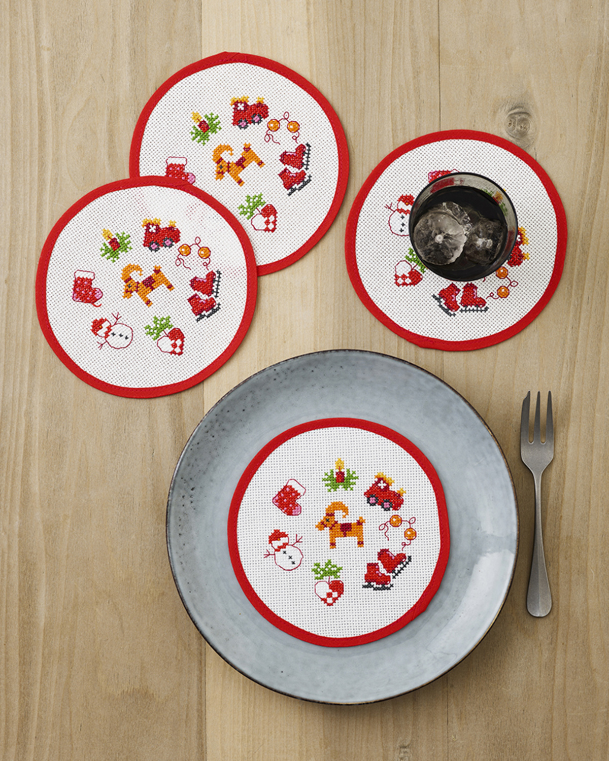 Med broderikittet Buk i midten –  kan du tilføje en hyggelig og personlig julestemning til bordet med Permins skønne broderi. Sættet indeholder 4 runde mellemlægsservietter (Ø15 cm), broderet med korssting og stikkesting på Aida (5,5 masker/cm), der i forvejen er påmonteret med kantbånd.