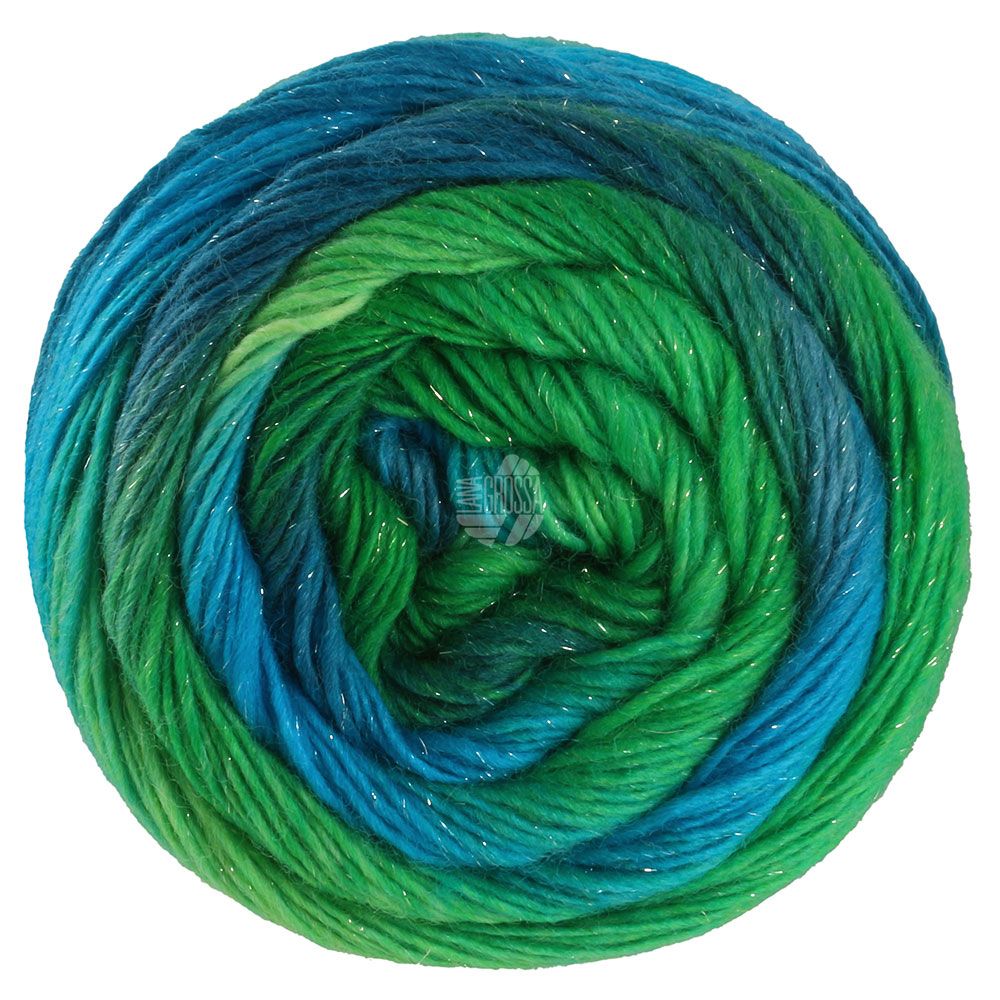 Lana Grossa Meilenweit 100 Color Mix Sparks – strømpegarn med farveskifte og et strejf af glitter. Perfekt til sokker og accessories, der skal have lidt ekstra liv.