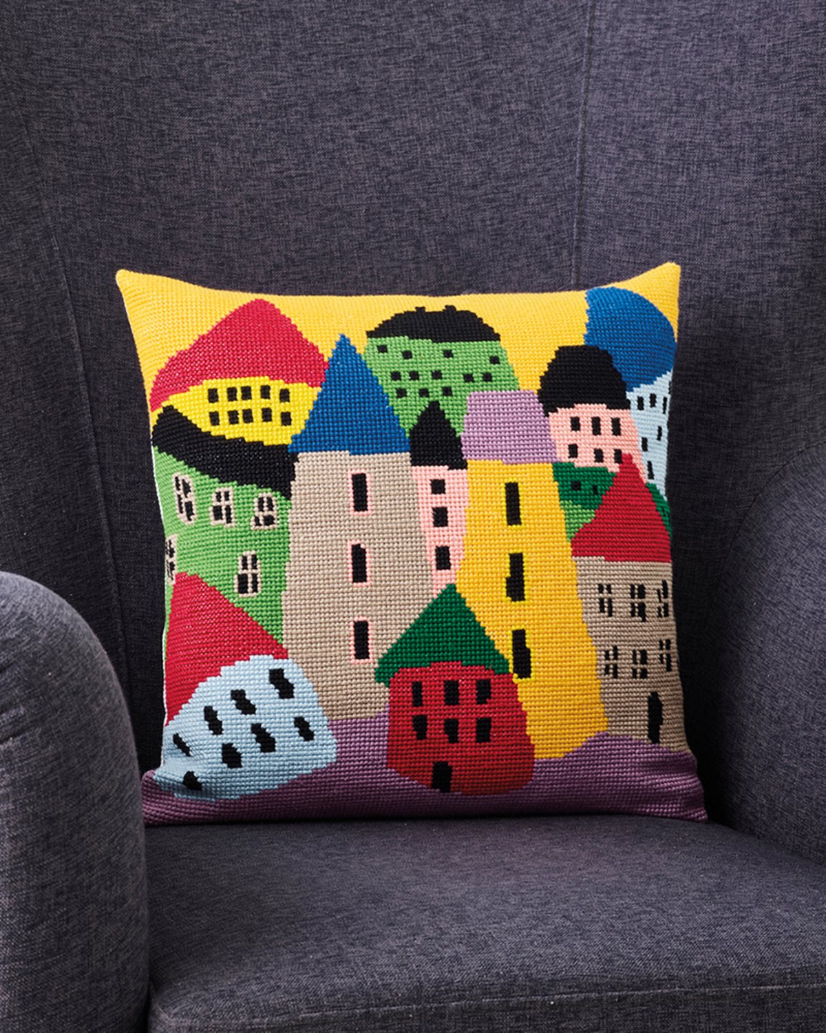 🏠 De Skæve Huse – Broderikit til Pude (40×40 cm)