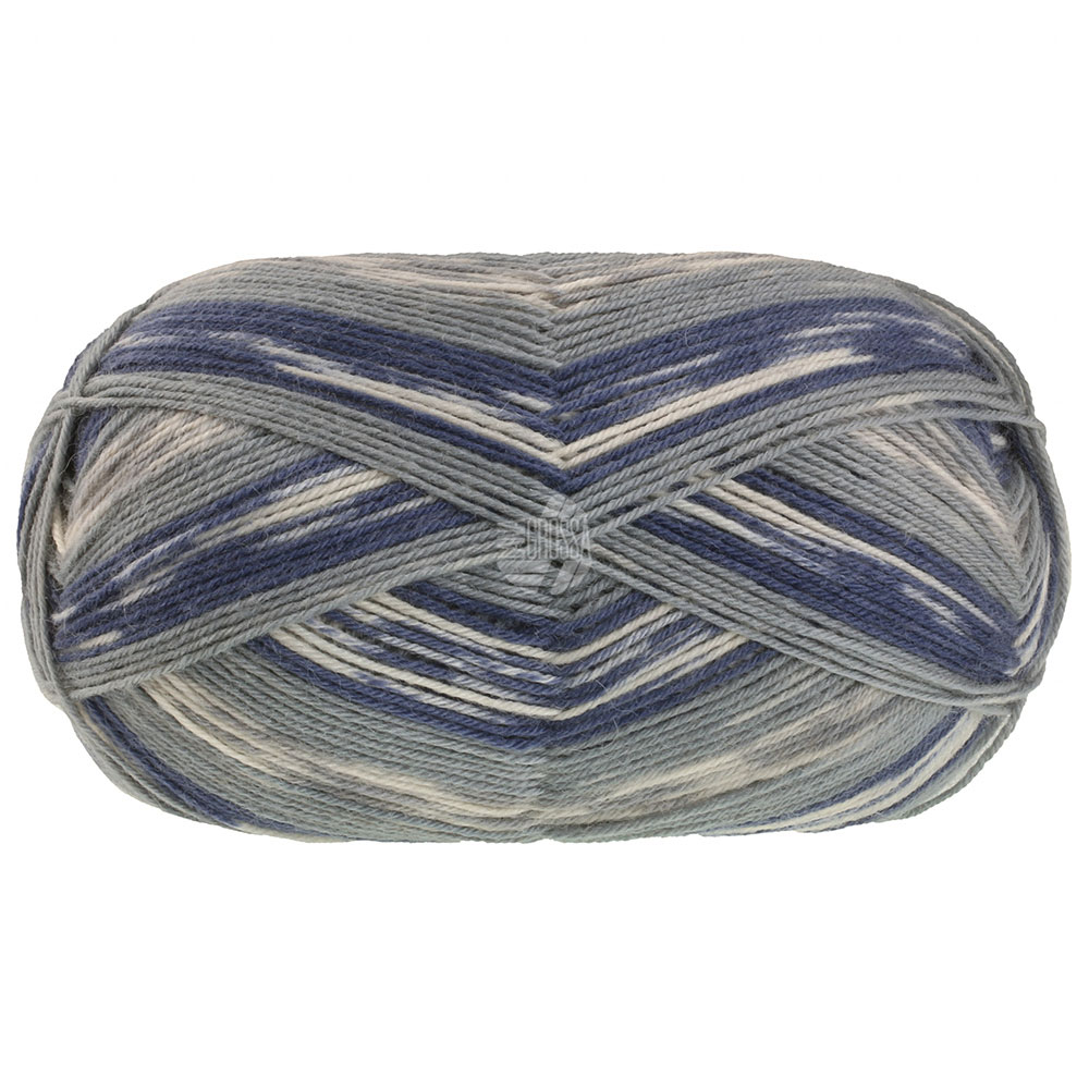 Lana Grossa Meilenweit 100 Denim Mix 4659 – Strømpegarn kombinerer styrken fra virgin wool (75 %) med holdbarheden fra polyamid (25 %) og leverer et strømpegarn, der både er maskinvaskbart og slidtstærkt – ideelt til strømper, vanter og praktisk brug