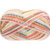 Strømpegarnet Fondo fra tyske Lana Grossa, er strømpegarn med fine striber i mange forskellige farver og bredder. Der er nok garn i et nøgle, der vejer 100 gram, til et par strømper i str. 47.