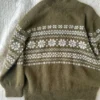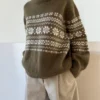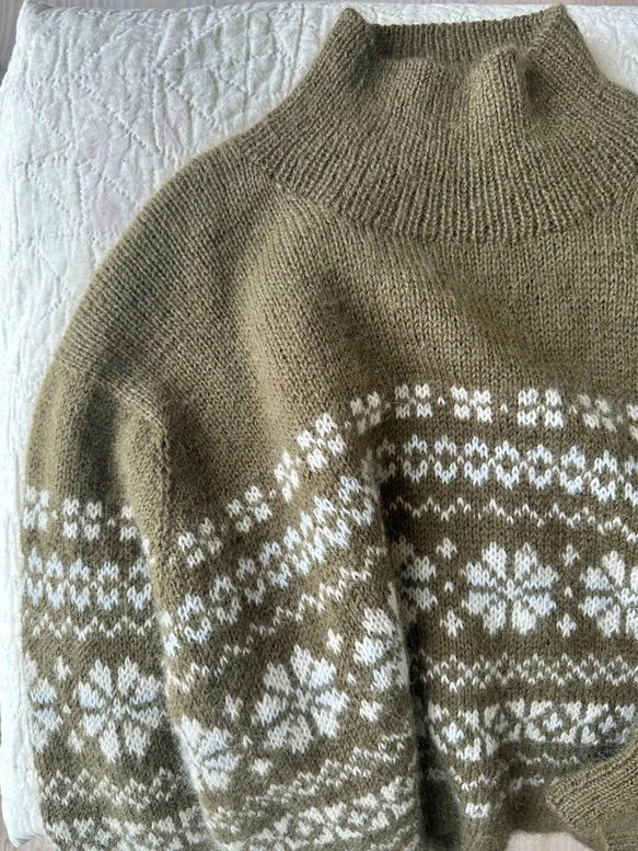 Harriet Sweater – Strikkeopskrift til en rummelig sweater med høj hals og et meget flot mønster med blomster. Sweateren strikkes oppefra og ned og dens snedige konstruktion gør, at alle mønsterfarver strikkes rundt på retsiden.