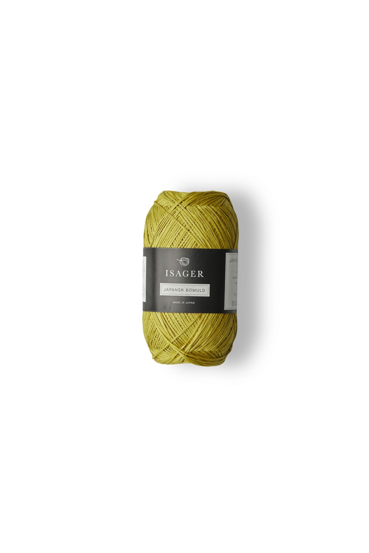 Japansk bomuld farve 15 Gulgrøn fra Isager Garn er et helt særligt garn, der virkelig skiller sig ud på grund af sin specielle struktur og høje kvalitet. Det er 100% bomuld, men ikke helt som det, vi normalt forbinder med bomuldsgarn. Garnet er nemlig fladere og lidt båndet i strukturen, faktisk ligner det papir, det specielle udseende giver det en rustik, men stadig meget elegant fornemmelse, når du arbejder med det.