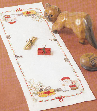 Skab ægte julestemning på bordet med denne fine juledug, hvor julemanden deler gaver ud, omgivet af små nisser og julepynt. Motivet er broderet hele vejen rundt langs kanten og giver et hyggeligt og festligt udtryk, der passer perfekt til advent, julefrokoster og hyggelige decemberdage.