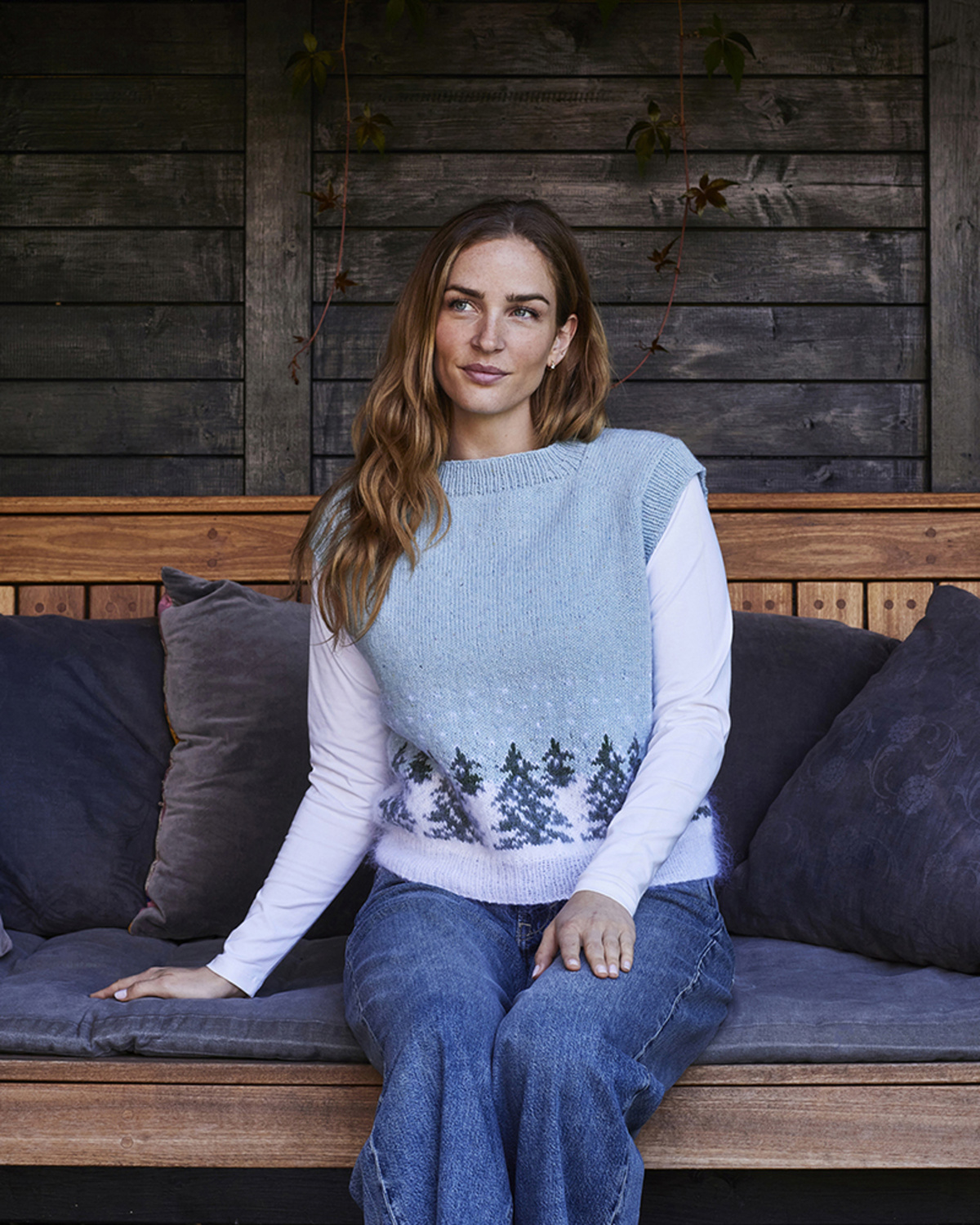 Julevest med grantræer – Strikkeopskrift til en lun julevest med sne og grantræer. Vesten strikkes oppefra og ned med garnet Luna og Bella by Permin.