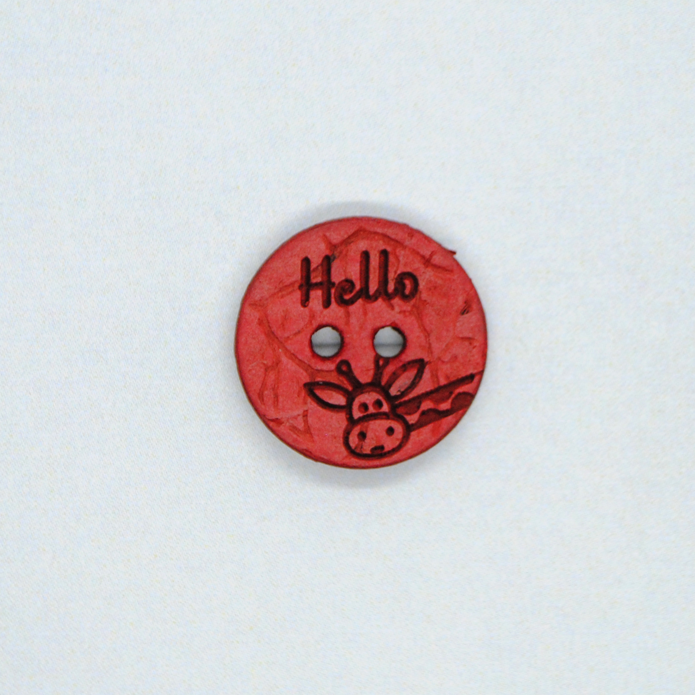 Kokosknap med giraf i rød er en lille knap med masser af charme! Denne fine kokosknap måler 15 mm i diameter og har et indgraveret motiv af en sød giraf og teksten “Hello”. Perfekt til børnetøj, accessories eller som en lille detalje, der får smilet frem.