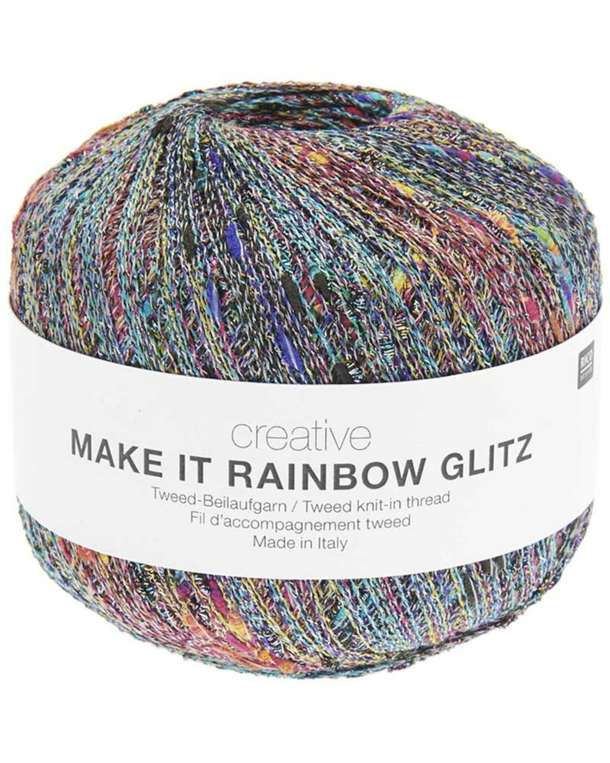 Garnet Make it Rainbow Glitz White fra Rico Design er kun beregnet til, at være med i strik og hækling som en følgetråd. Her kan du lave dit helt eget tweed-garn og Make it Rainbow Glitz White er ikke tykkere end ganske almindeligt sytråd og påvirker ikke din strikkefasthed.