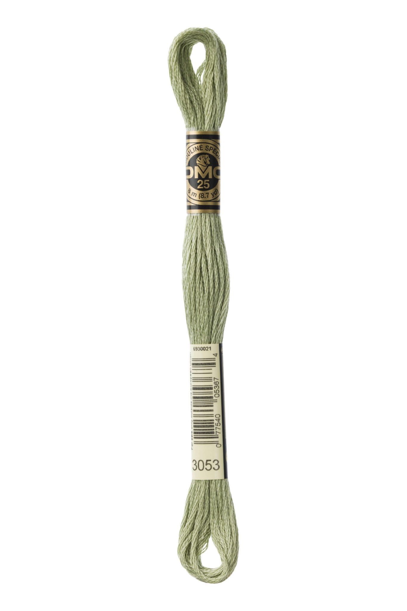 Broderigarn Mouline Spécial 25 farve 3053 Støvet Grøn, også kaldet Amagergarn. Det er et af de mest populære broderigarner på markedet og bruges ofte til broderi og korssting.