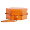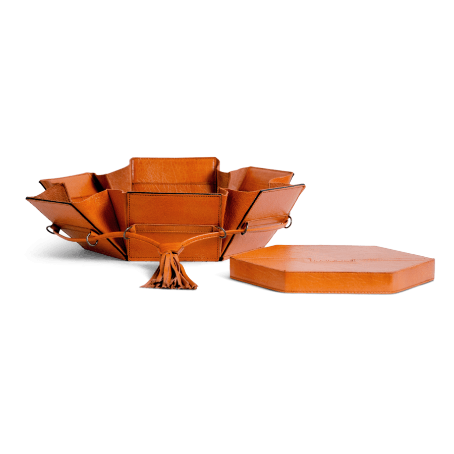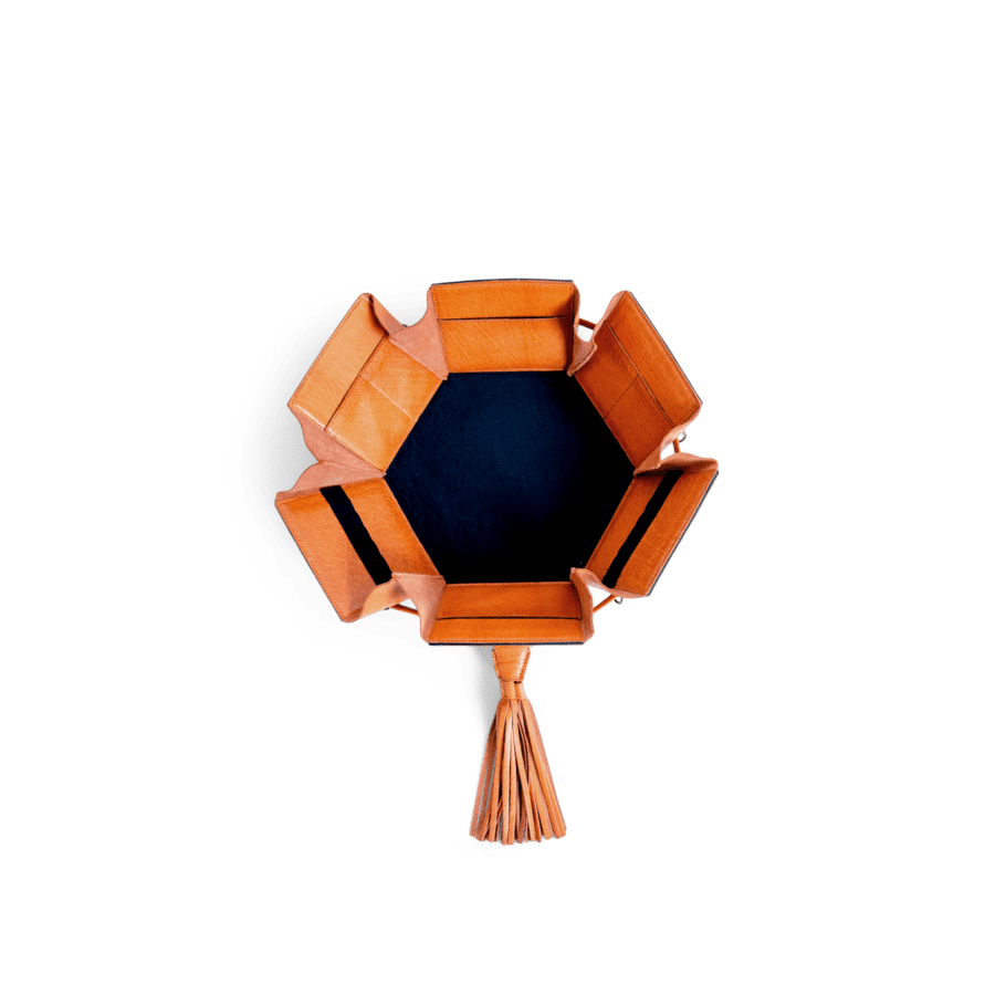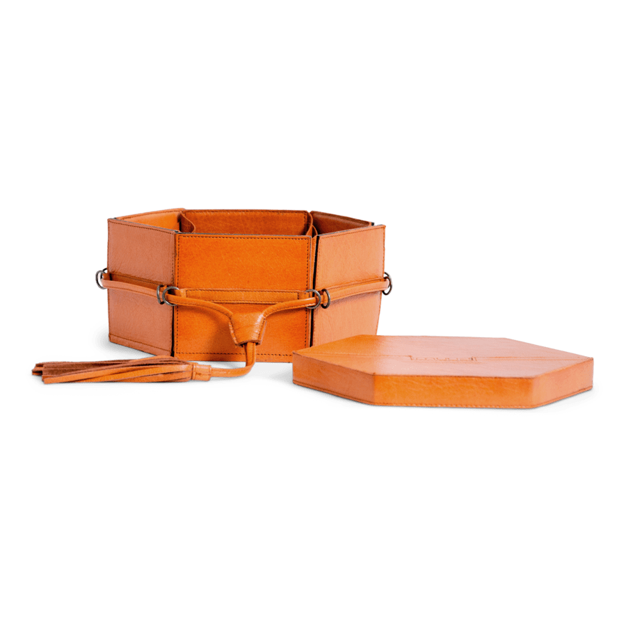 Når læderbåndet på boksen løsnes, foldes den sekskantede form ud. Brug de praktiske forlommer til at holde dine broderigarn, strikkepinde og tilbehør pænt organiseret.