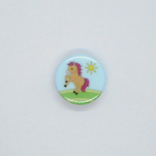 Giv dit syprojekt et legende og farverigt udtryk med denne fine plastikknap med hest 15 mm i lyseblå. Knappen måler 15 mm i diameter og har en kanal på bagsiden til nem isyning. Den er perfekt til børnetøj, accessories eller kreative hobbyprojekter, hvor der skal lidt ekstra sjov og charme til.