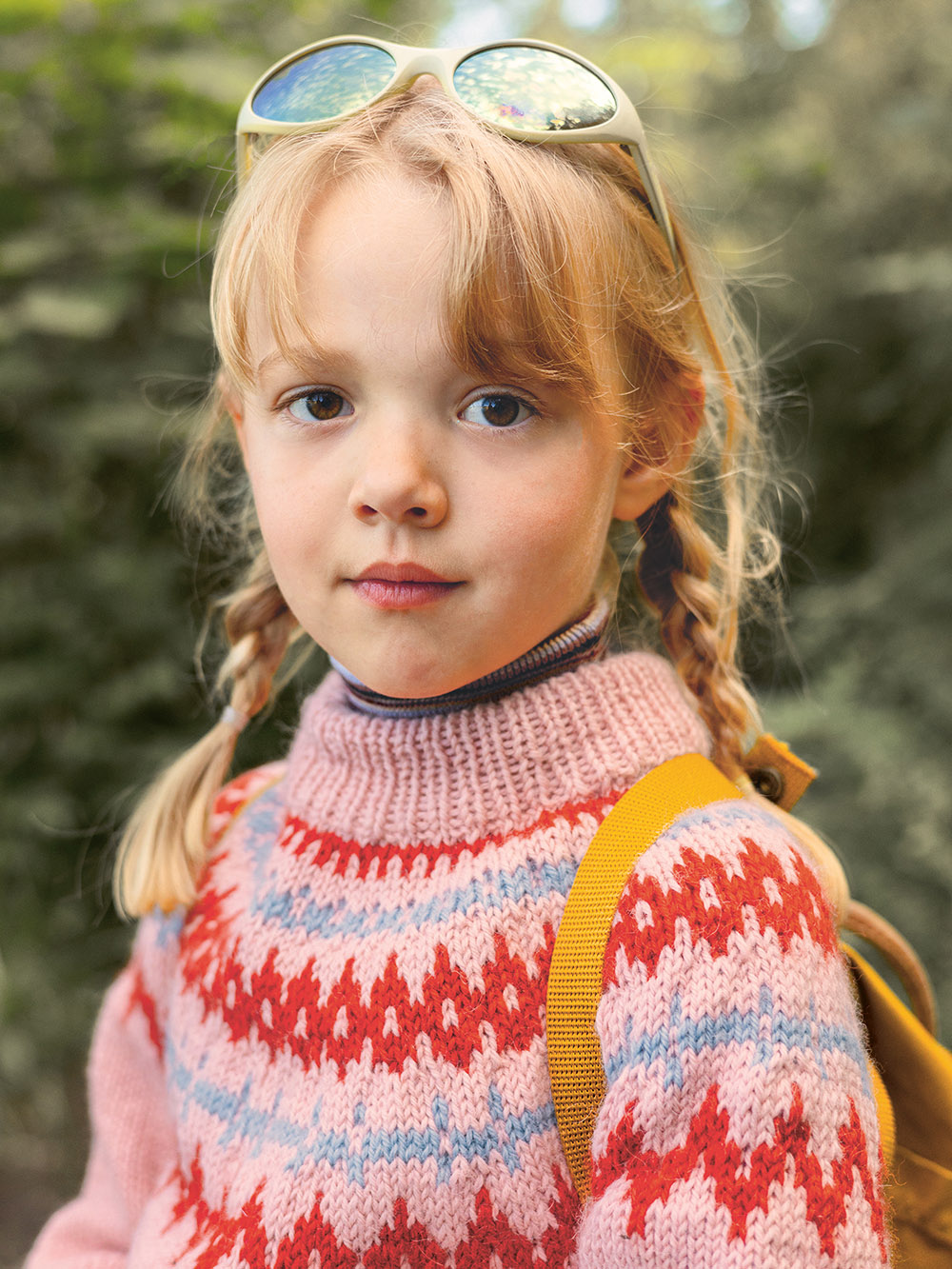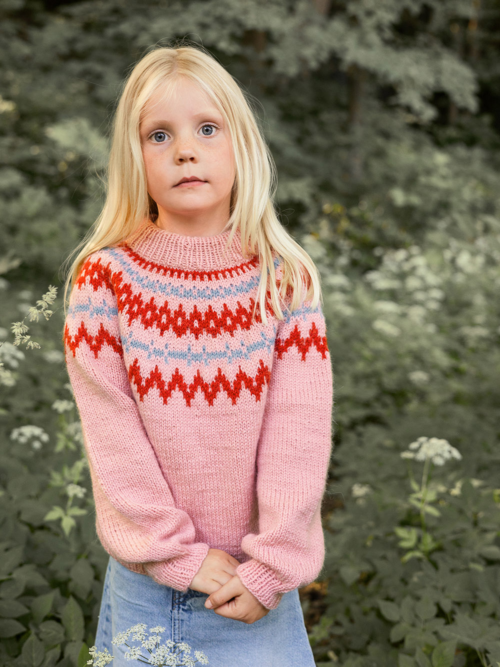 Polar Light – Strikkeopskrift til en skøn børnesweater i traditionelt norsk mønster med tre farver. Opskriften indeholder både en model, der strikkes nedefra og op og en der strikkes oppefra og ned, så alle kan være med. Der er også en udgave i hæftet, hvor sweateren strikkes med fire farver. Polar Light strikkes med det meget bløde garn Alpakka Ull fra Sandnes Garn.