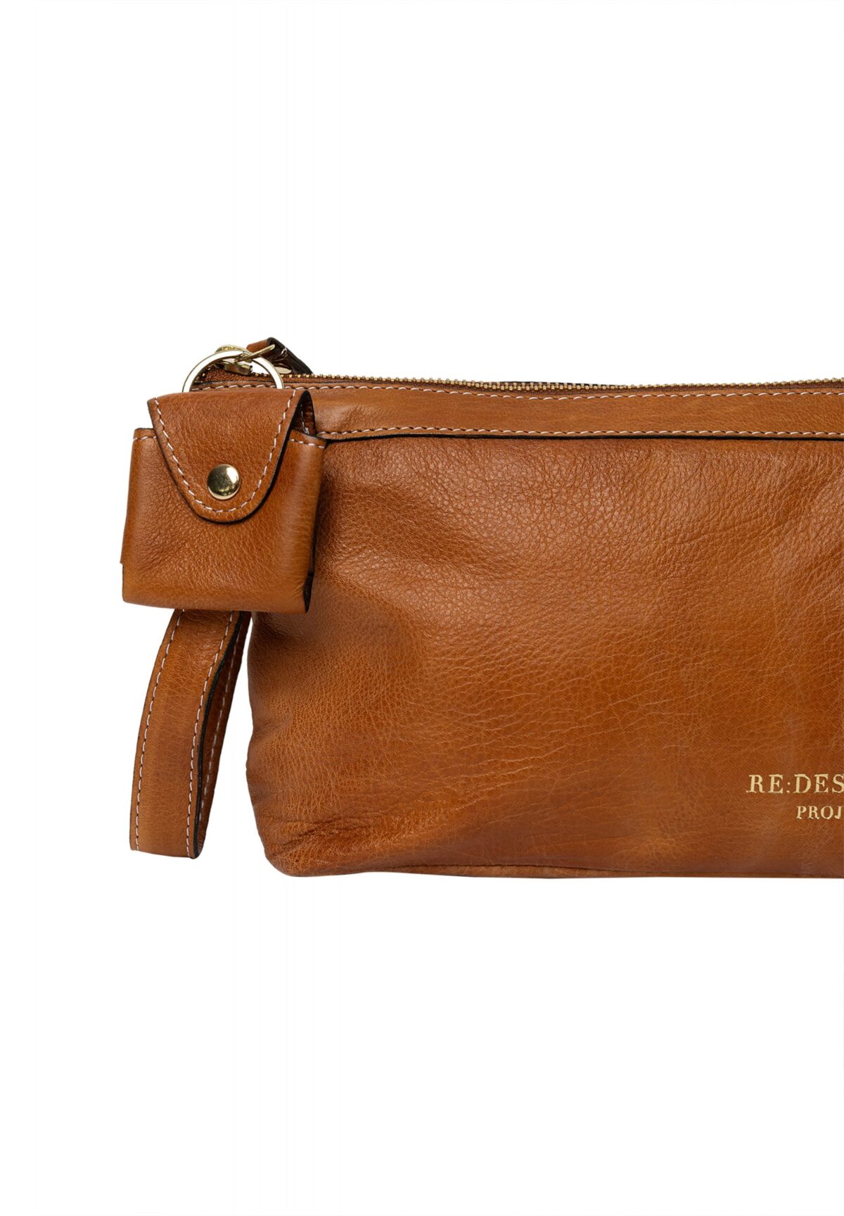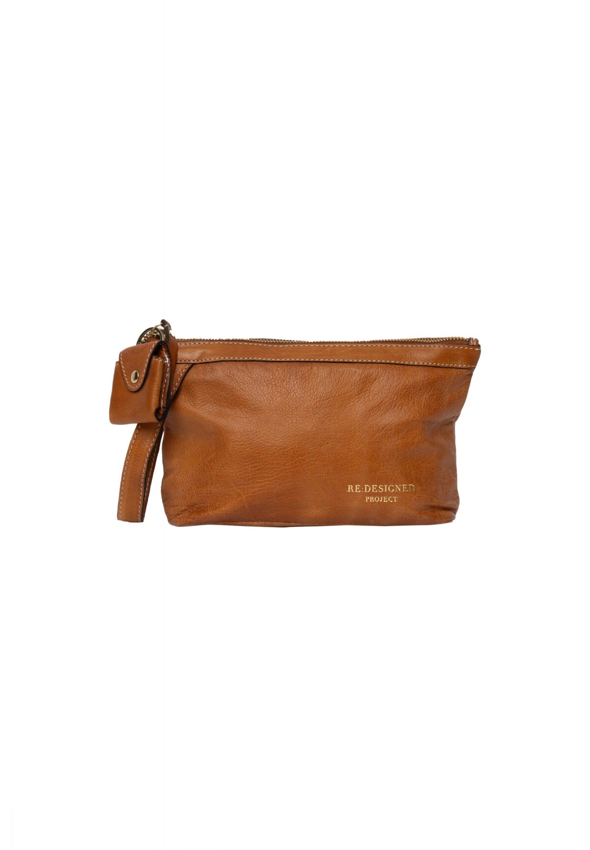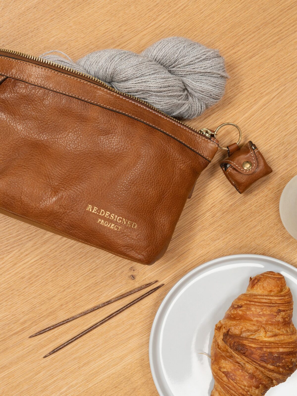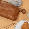 Project 4 Burned Tan/Gold fra Re:designed er en mindre clutch lavet af blødt læder med plads til et lille strikkeprojekt og strikketilbehør. Clutchen har fire åbne lommer indeni, så du kan organisere dine ting og nemt finde dem igen. Den lukkes med en metallynlås i “guldlook”, som sikrer, at dit strikkeudstyr altid er i sikkerhed inden i tasken. Clutchen har et lille håndtag på siden, der gør det nemt at tage den med sig. En ekstra funktion er en nøglering designet til at opbevare dit målebånd, så det ikke bliver væk.