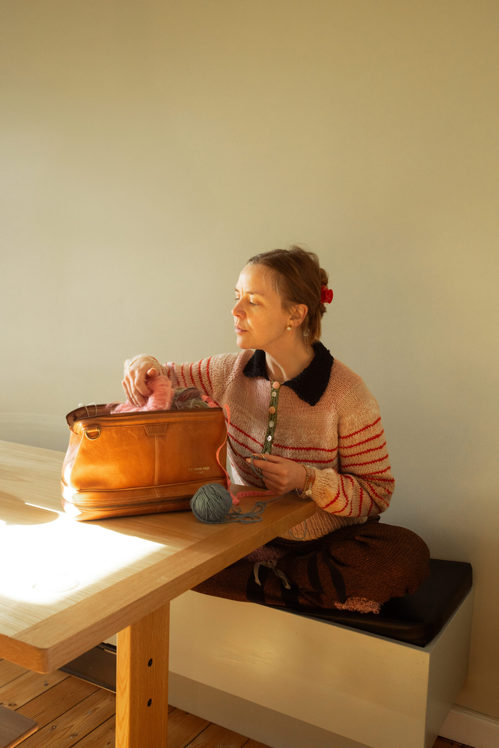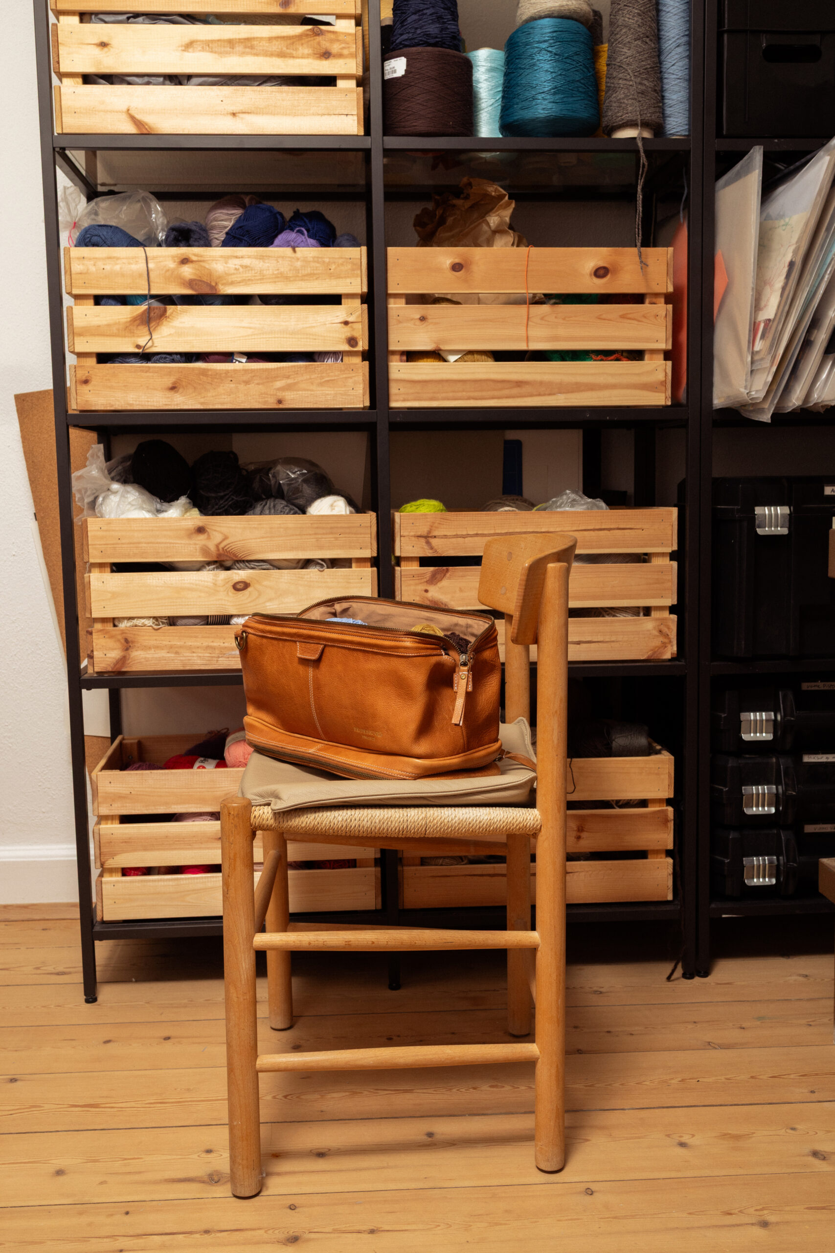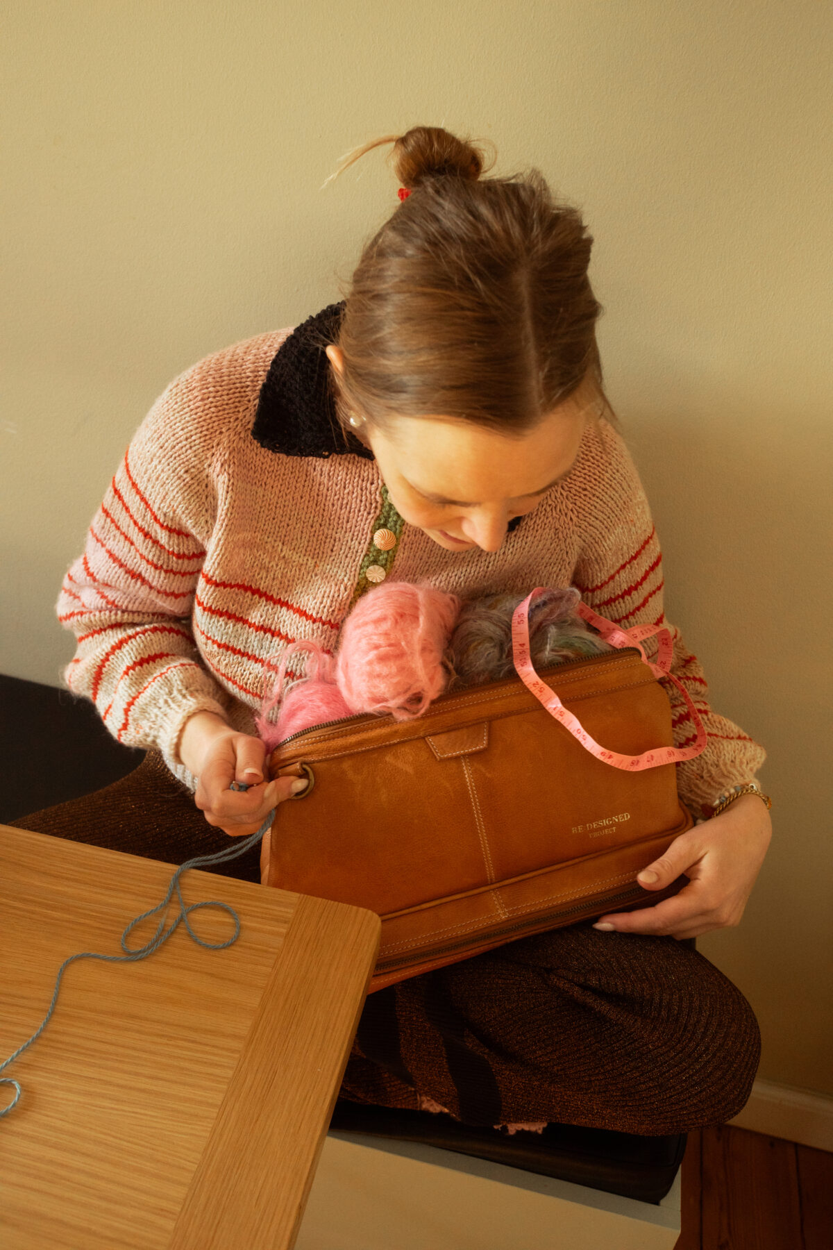 Project 45 Burned Tan – Luksus strikketaske fra Re:Designed. Projekt 45 er den ultimative kombination af stil og funktionalitet, skabt til dig, der elsker at strikke. Den elegante taske, designet i klassisk lægestil, er fremstillet af førsteklasses læder og tilbyder smarte løsninger til dine strikkeprojekter.