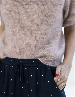 Blusen er kort og en smule løstsiddende. Længden, og også bredden, kan nemt reguleres, da blusen strikkes oppefra og ned. Blusen på billedet er str. M. Modellen bruger str. S/M.