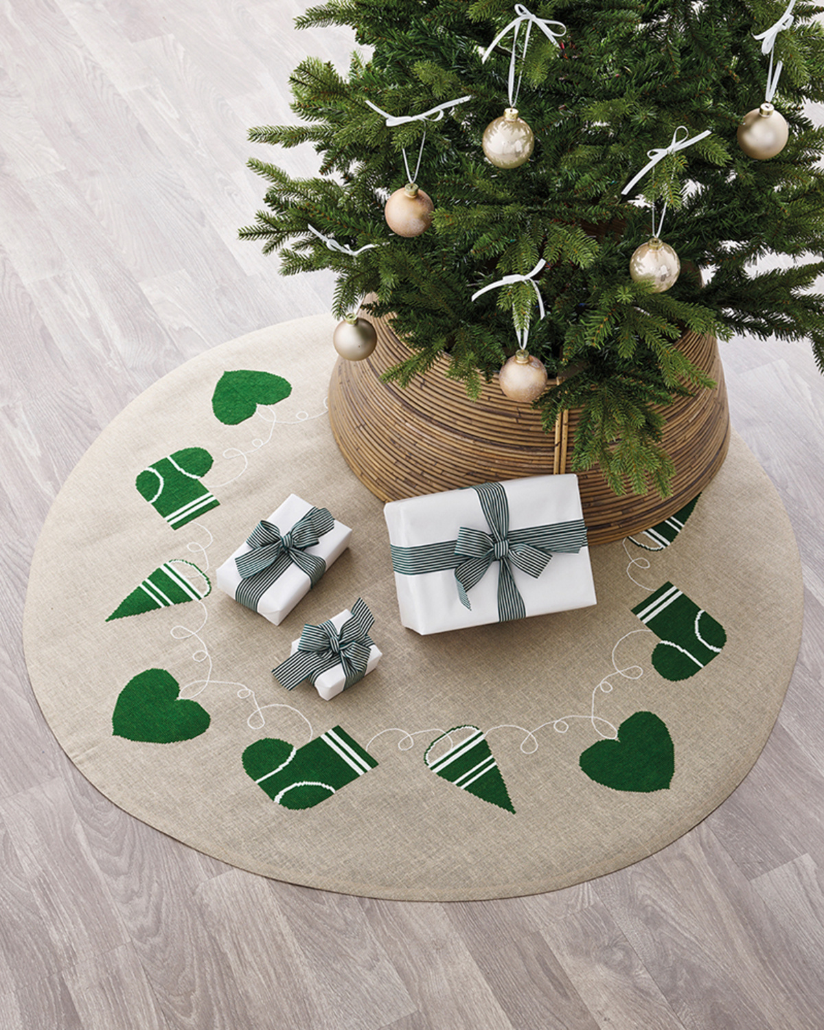 Sok, Hjerte og Kræmmerhus – Broderikit til et rundt juletræstæppe med et enkelt og meget klassisk motiv med grønne julesokker, hjerter og kræmmerhuse på en snor som guirlande rundt på tæppet.