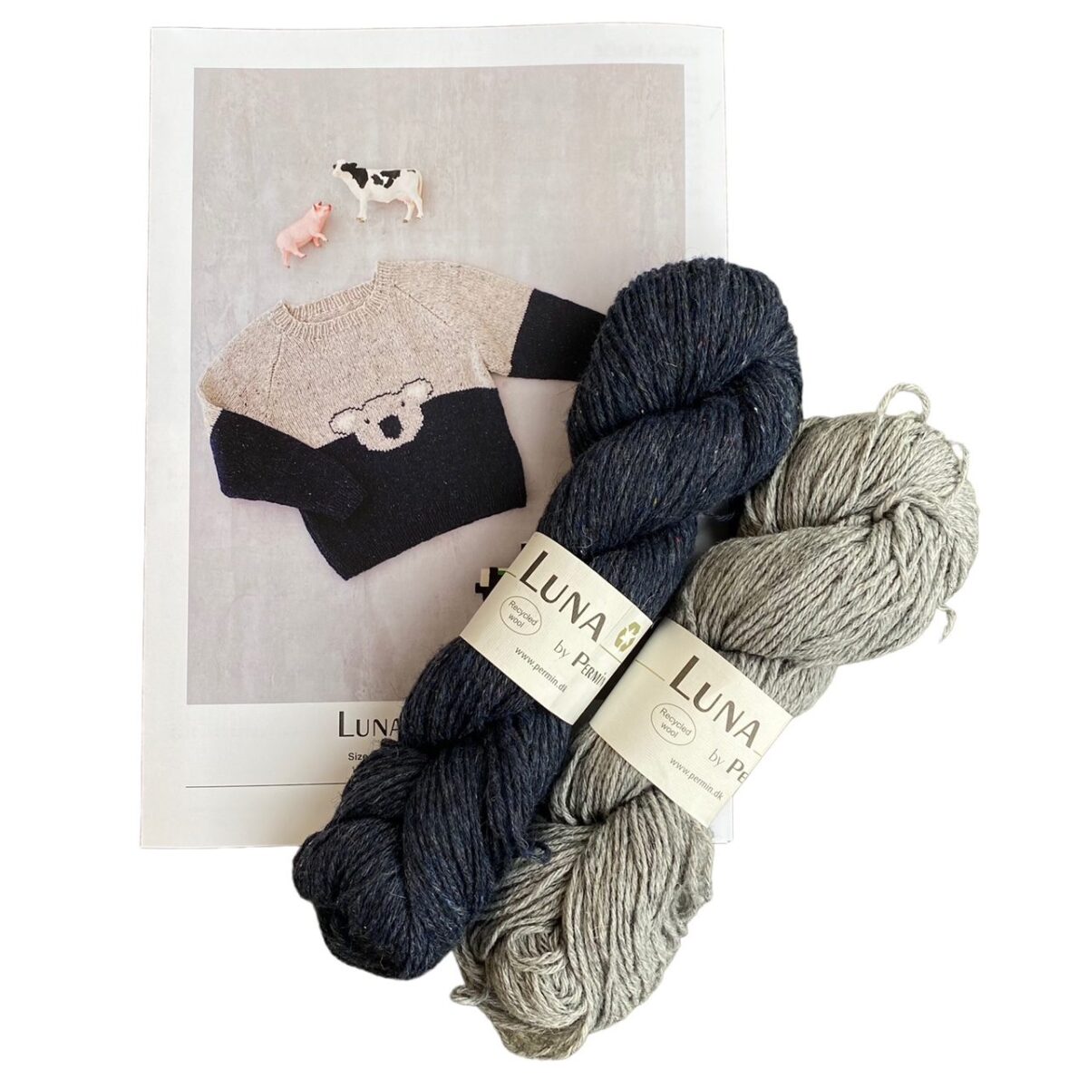Strikkekit til en Koala Bluse i Marine og Lys Grå. Opskriften er fra str. 1 – 6 år og er nok garn til en bluse i str. 6 år.