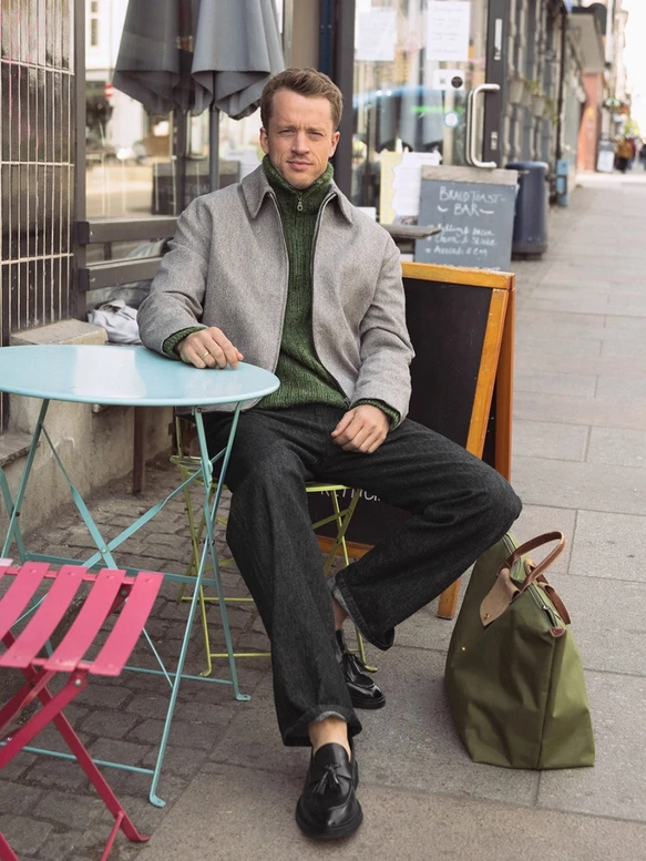 Tarjei Sweater – Strikkeopskrift til en lækker blød herresweater med lynlås i halsen. Sweateren strikkes oppefra og ned med to tråde af garnet Tynn Peer Gynt fra Sandnes Garn.