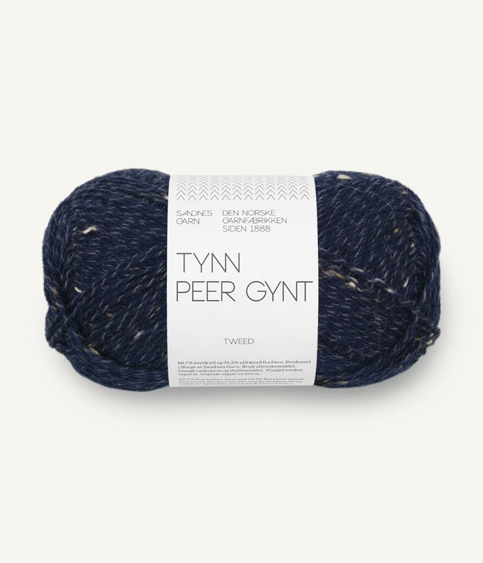 Garnet Tynn Peer Gynt 5585 Marineblå med natur tweed er en videreudvikling af det gamle Peer Gynt, som har eksisteret siden 1938. Tynn Peer Gynt er til forskel fra Peer Gynt et noget tyndere 3-trådsgarn, som passer fint til pinde nr. 3.